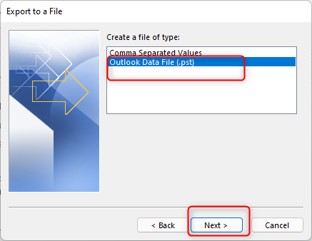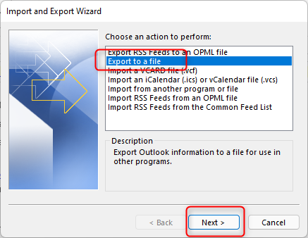 Select Export to a file and click Next: