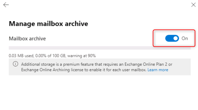 Note that In-Place Archiving is only available for certain Office 365 plans. If you do not see the option to enable In-Place Archiving, it may not be available for your subscription.