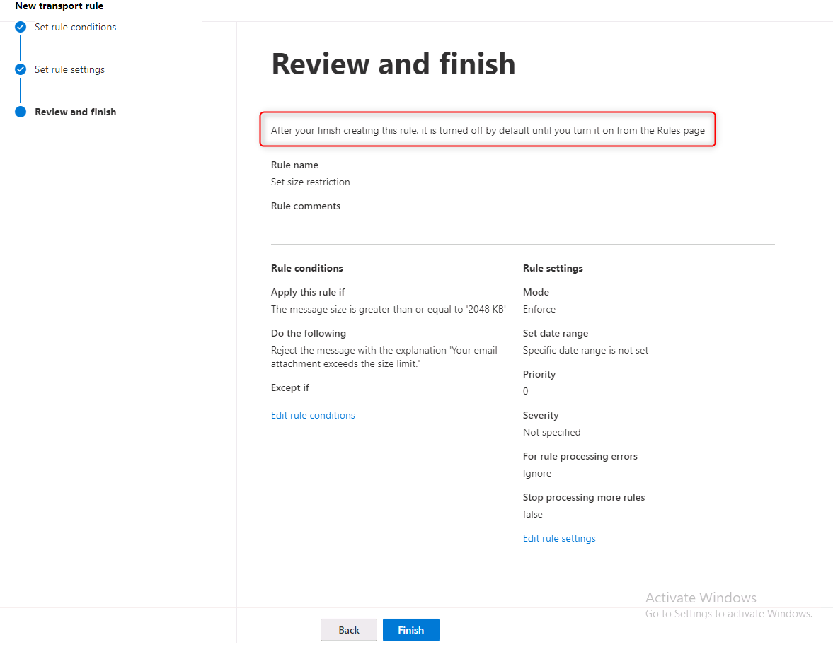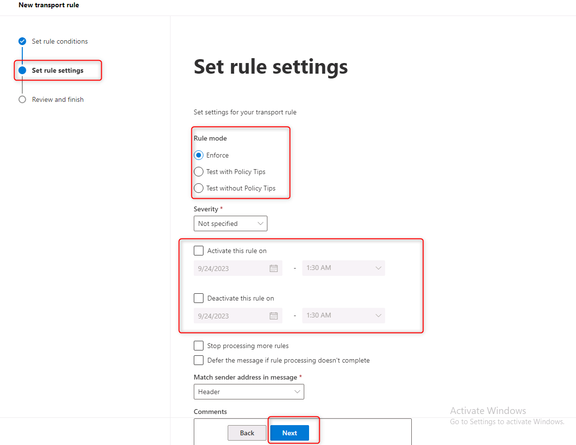 In the Set rule settings page, there are options to set the rule. For example, mode or activation date. Then click Next.