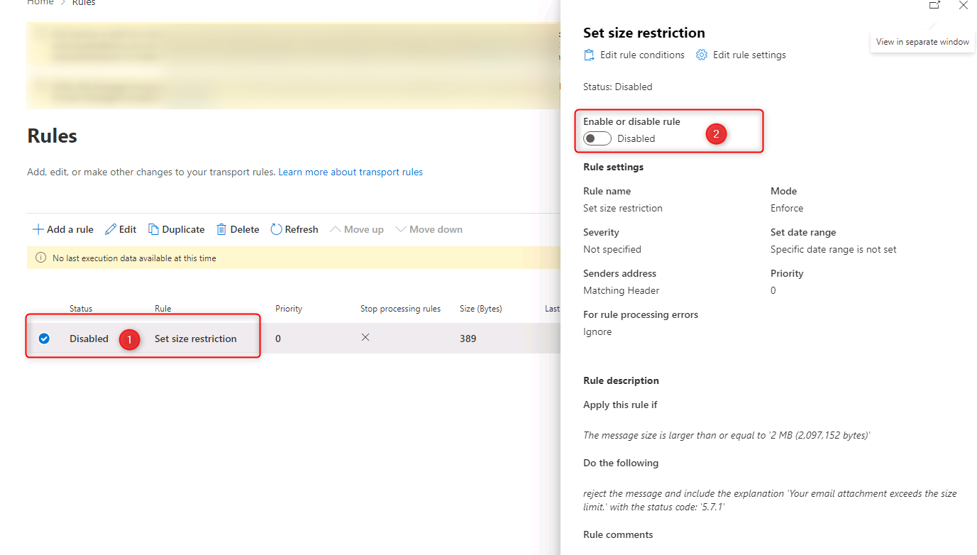 Navigate to Exchange Admin Portal (admin.exchange.microsoft.com) and select (1) Mail flow -> (2) +Add a rule -> (3) Filter messages by size: